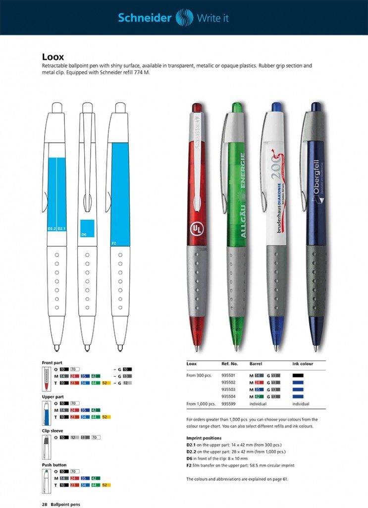 Parlak yüzeyli, şeffaf, metalik veya opak plastiklerden oluşan basmalı tükenmez kalem. Lastik tutma kısmı ve metal klips. Schneider dolum 774 M. ile donatılmıştır.