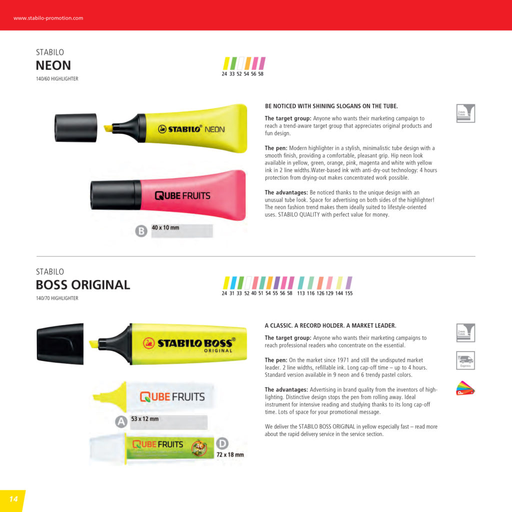 The pen: On the market since 1971 and still the undisputed market leader. 2 line widths, refillable ink. Long cap-off time – up to 4 hours. Standard version available in 9 neon and 6 trendy pastel colors.